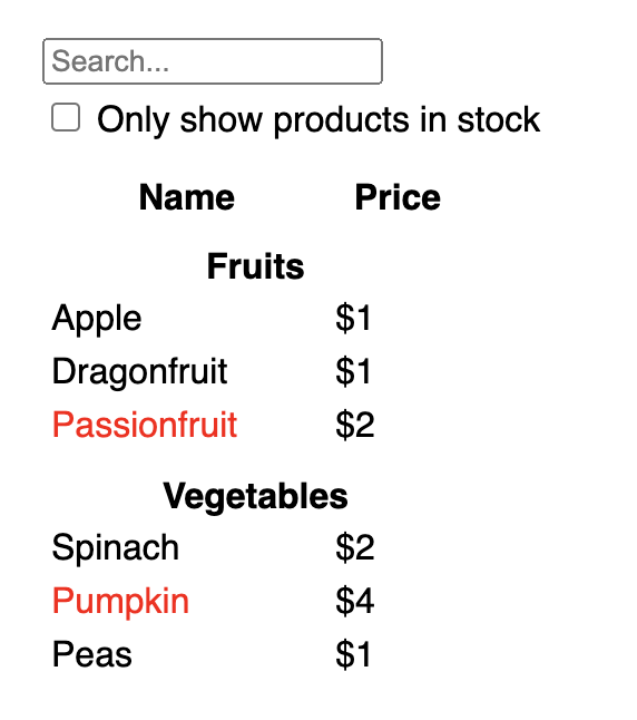 شما می‌توانید شروع به دیدن نحوه‌ی رفتار برنامه‌ی خود کنید. مقدار اولیه filterText را از useState(”) به useState(‘fruit’) در کد محیط آزمایشی زیر ویرایش کنید. خواهید دید که هر دو متن ورودی جستجو و جدول به‌روزرسانی می‌شوند.